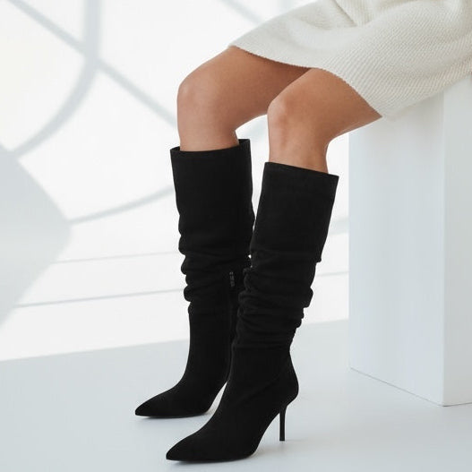 SOHIA FW25 Stivali alti in morbido camoscio nero con effetto arricciato, perfetti per un look elegante e moderno. La punta affusolata e il tacco sottile di circa 8 cm valorizzano la silhouette, donando un’allure raffinata e sensuale. Un modello versatile, ideale per completare outfit sia da giorno che da sera.