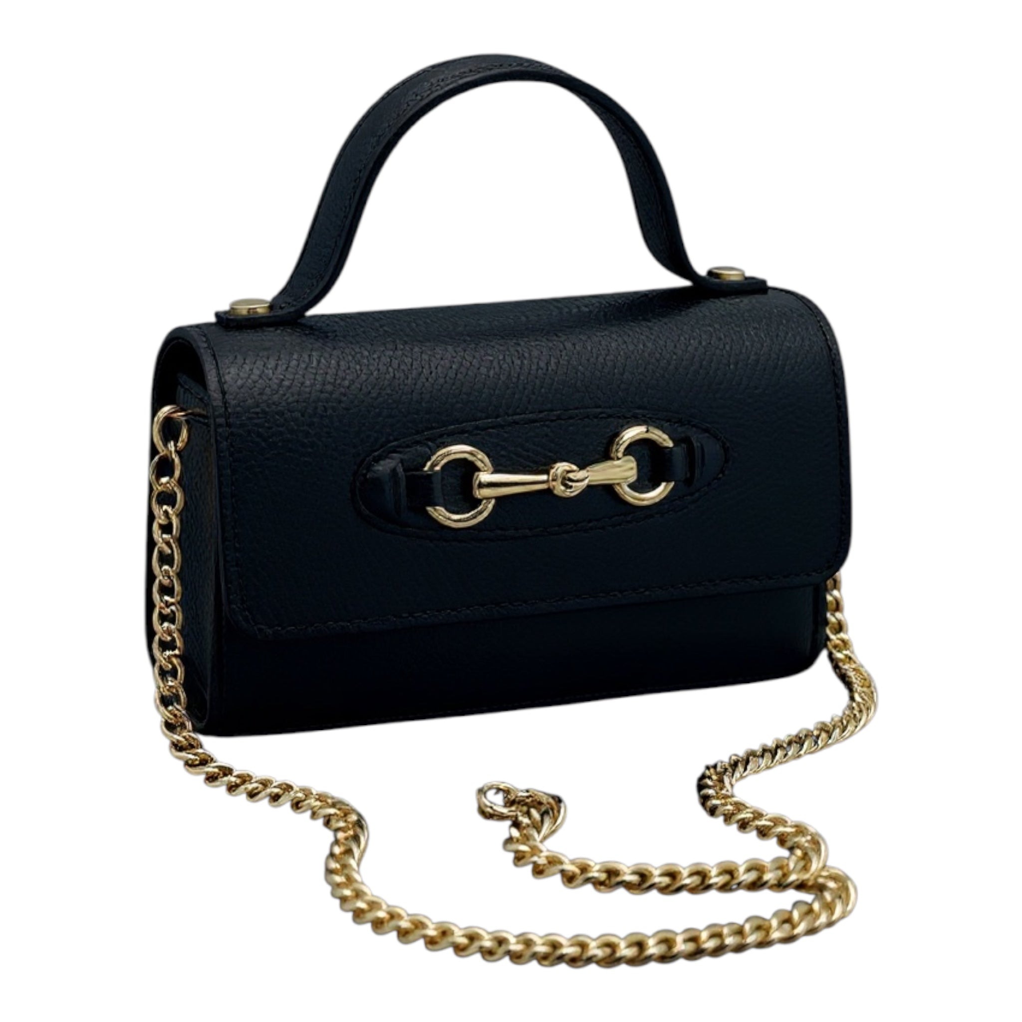 Il dettaglio metallico frontale aggiunge un tocco raffinato e senza tempo, mentre la tracolla in catena dorata permette di indossarla comodamente anche a spalla.